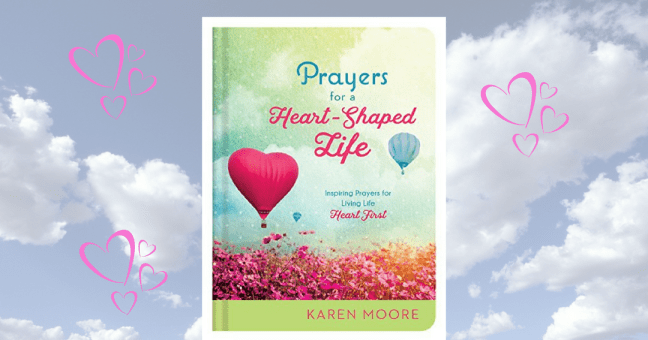 With its whimsical hardcover “Prayers For a Heart-Shaped Life” by author Karen Moore will catch your attention if the title doesn’t first. Hot pink heart hot air balloons and flowers along with blue balloons and puffy clouds just make this cover happy. I want to smile every time I look at it. The small but mighty book is brimming full with 200 prayers that are “inspiring for living life heart first.” I was intrigued by the title and won over by the cover. Then I started reading……oh my! I was so hooked. It is 224 pages and I wanted more.