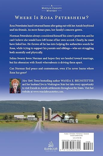 In book one of A Mifflin County Mystery series, after a night out with her boyfriend, Rosa Petersheim has disappeared from the Big Valley without a trace. Norman Petersheim always considered himself his sister’s protector, and he can’t believe she would have left home of her own accord. Clearly, he must have failed her. He throws all he has into helping the authorities search for Rosa, while trying to support his parents and siblings–who are struggling both mentally and physically. Salina Swarey loves Norman and hopes they are headed toward marriage, but his obsession with Rosa’s whereabouts is driving them apart. Can Norman find peace and contentment, even if he never learns where Rosa has gone?